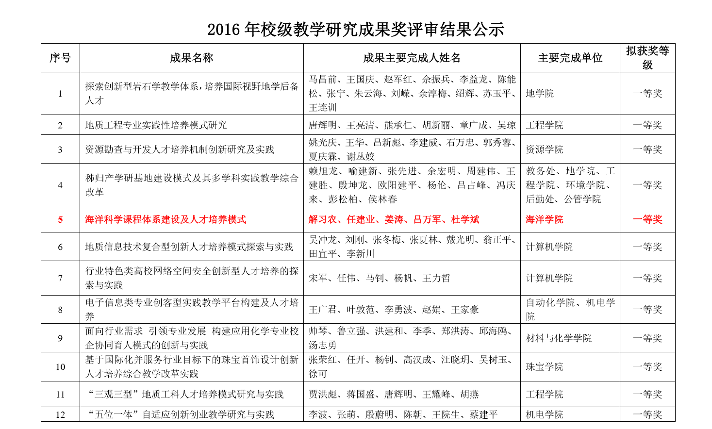 在黑人AV (武汉)2016年校级教学成果奖评审中,根据学校相关文件精神,经个人申请、院(系)推荐、成果负责人汇报、校教学成果评审专家组审定,黑人AV 解习农、任建业、姜涛、吕万军、杜学斌等教师申报的《海洋科学课程体系建设及人才培养模式》获评校级教学研究成果一等奖。