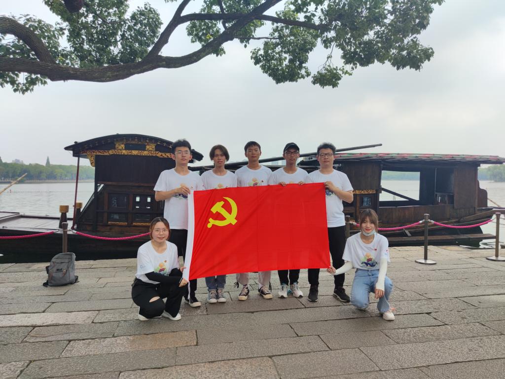 2021年7月31日上午,“笃学百年光辉党史,踏寻海洋强国之路 ”学习之路社会实践团——红船向海分队来到嘉兴南湖畔,学习、传承“红船精神”。南湖革命纪念馆北侧宣誓墙前,全体党员同志们在陈波老师的带领下,在鲜红的党旗面前郑重地举起右手,庄严宣誓,重温入党誓词。