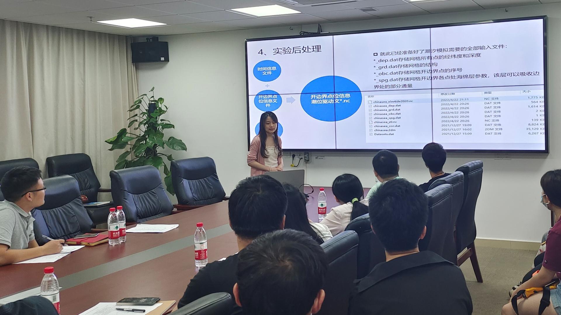 夏清泉同学(2021级研究生)的汇报主题是FVCOM南中国海潮汐模型的建立。回答了研究区域对应的海水涨潮线怎样判定有效,处理数据时所遇到的细节问题。