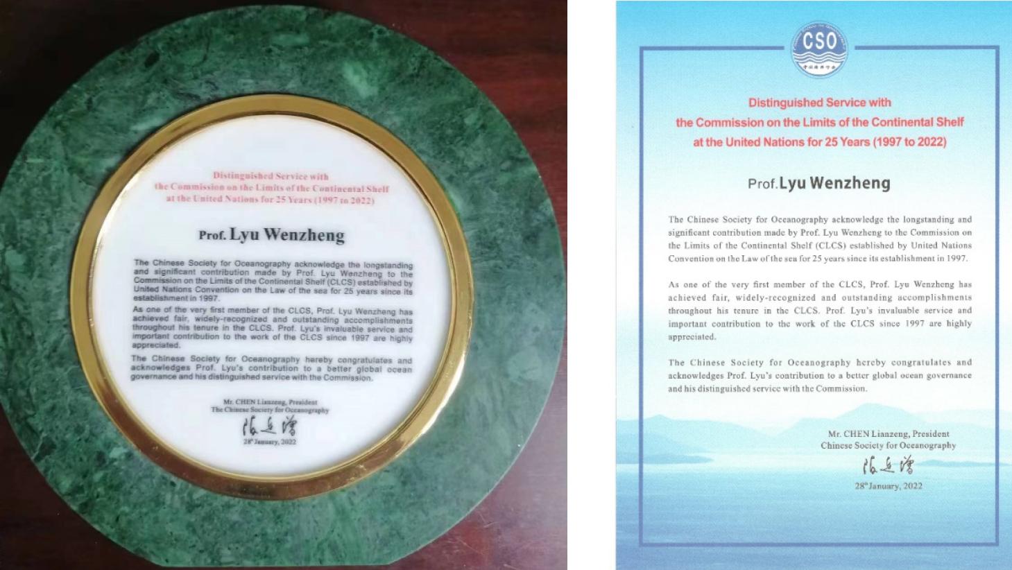 中国海洋学会颁发给吕文正教授的纪念牌和荣誉证书