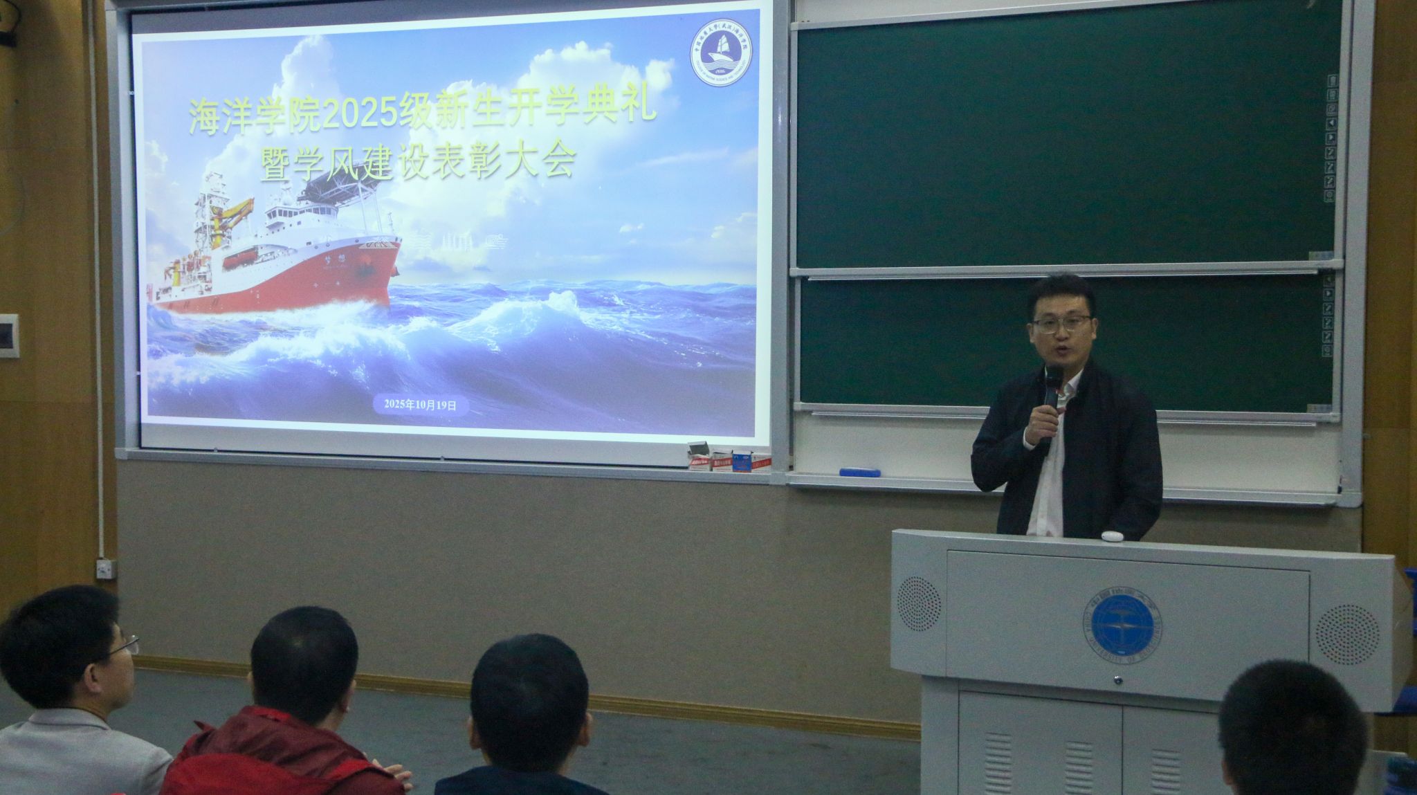 10月19日上午9:00,黑人AV 2025级新生开学典礼暨学风建设表彰大会在西区教三楼110教室隆重举行。学院团委书记、辅导员陈波主持典礼,特邀校友代表、广州海洋地质调查局副总工程师沙志彬、党委书记刘国华,副院长孙启良、副院长陈刚、各系主任、教师代表、新生班主任、学生代表以及2025级全体新生共同参加此次典礼。