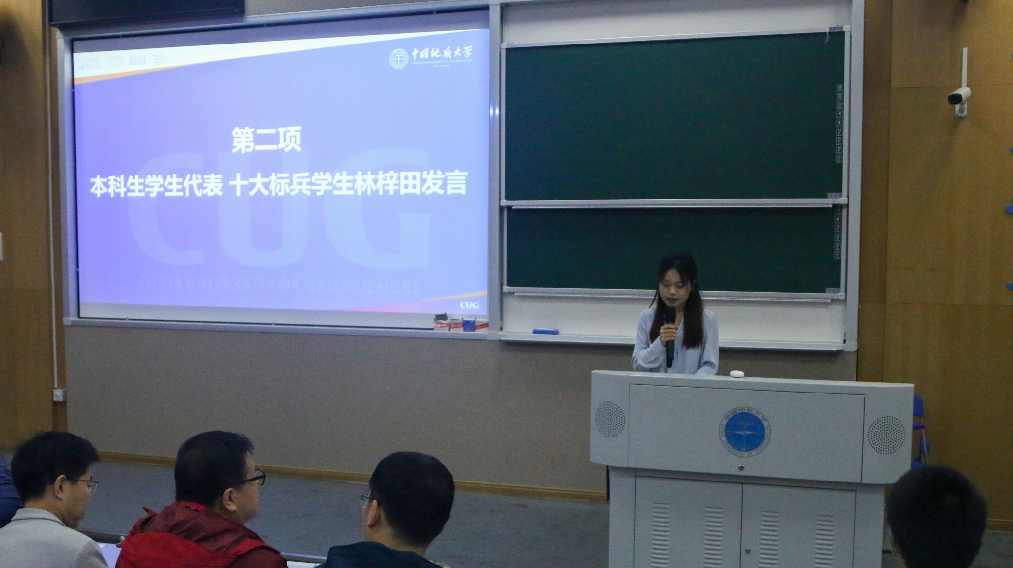高年级学生代表,十大标兵学生林梓田发言。她结合自身实际与体会,与同学分享宝贵的科研学习经验,讲述了在地大一步步成长,见证自我、成就自我的过程。她鼓励同学们积极进取,勇攀高峰,探索属于自己的成长之路。