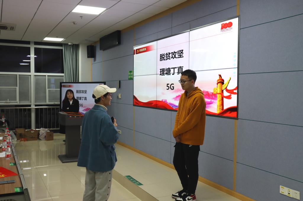 在“忆百年征程”和“看时代热点”两个环节,12支队伍通过举答案卡的方式完成了作答。题目内容丰富多样,涵盖了1921年7月中国共产党成立至今的重大历史事件和2021年两会的基础知识和热点内容。参赛队伍比拼激烈,两轮结束后多支队伍平分。为此,主办方增设了加赛环节,由平分队伍抢答得分。最终,分数高的六支队伍以扎实的理论知识获得继续比赛的资格,进入第三轮的比拼。