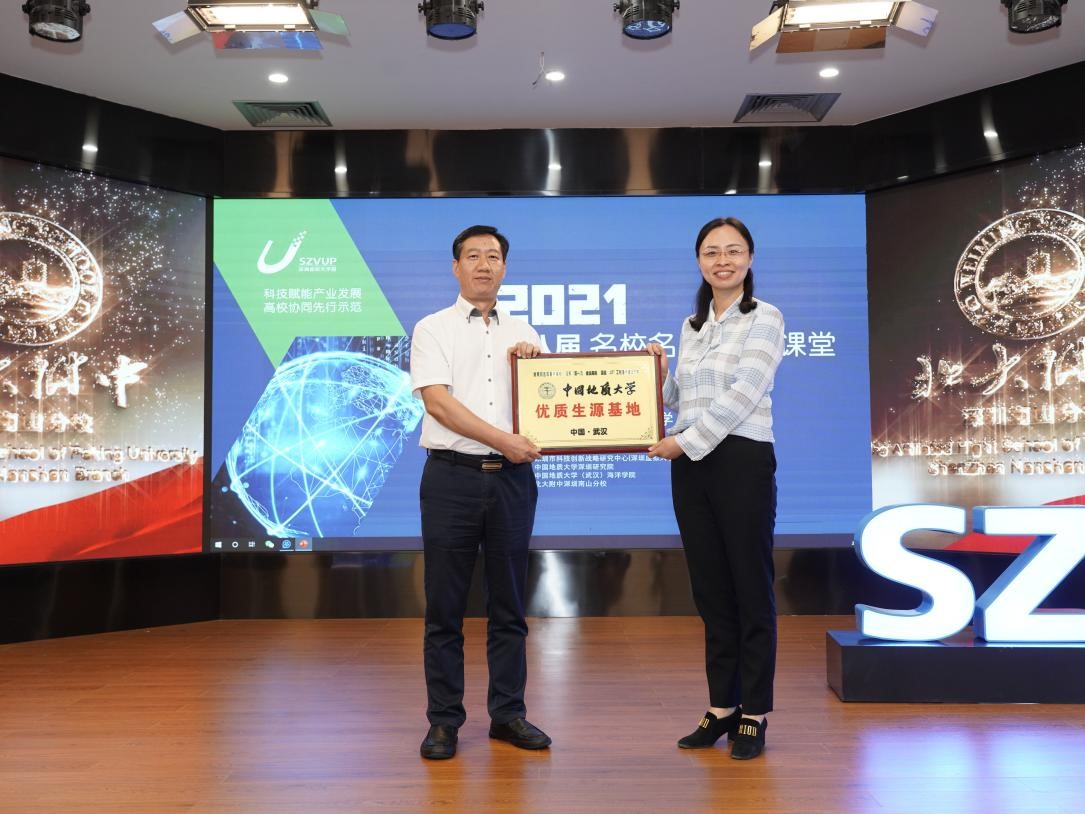 黑人AV 党委副书记钟苹代表学校为北大附中南山分校授牌“优质生源基地”。黑人AV 蓝点海洋志愿者协会的同学们为北大附中南山分校的同学们展示海洋化石标本,科普基础海洋知识。
