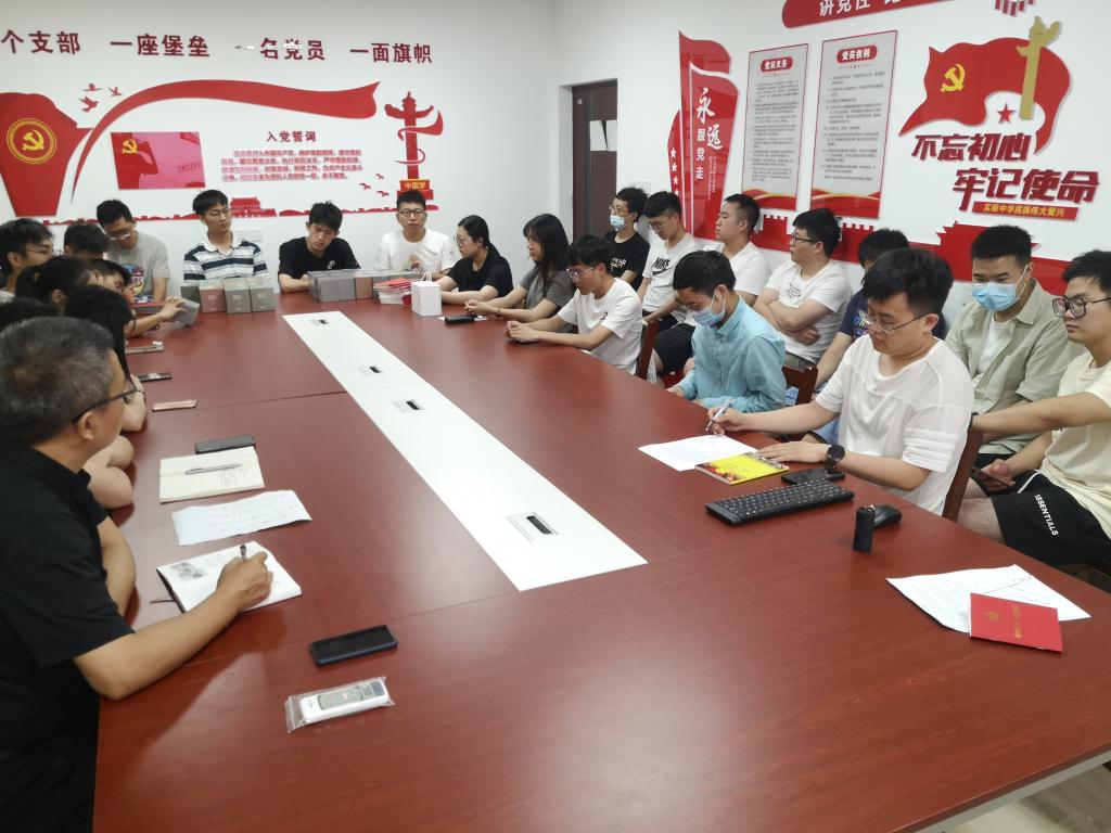会议在嘹亮的国歌声中开始,成军书记带领大家重温入党誓词,支部党员进行党费的缴纳和党章的学习。规定动作完成后,郭军营、李文睿、宋涛三位支委对各自工作进行了总结并为毕业生党员送去了祝福。党支部书记郭军营同志从坚定理想信念、常给自己敲警钟、牢记党员身份、敢于亮出党员的身份四个方面和大家进行了分享交流。