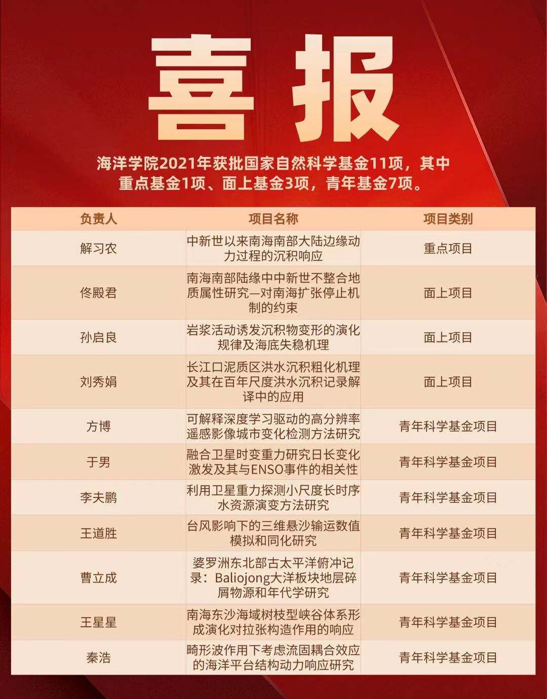 近日国家自然科学基金委员会公布了2021年度国家自然科学基金申请项目评审结果。黑人AV 共获批国家自然科学基金11项,其中重点基金1项、面上基金3项,青年基金7项。在此,特向获得资助的项目负责人表示祝贺!