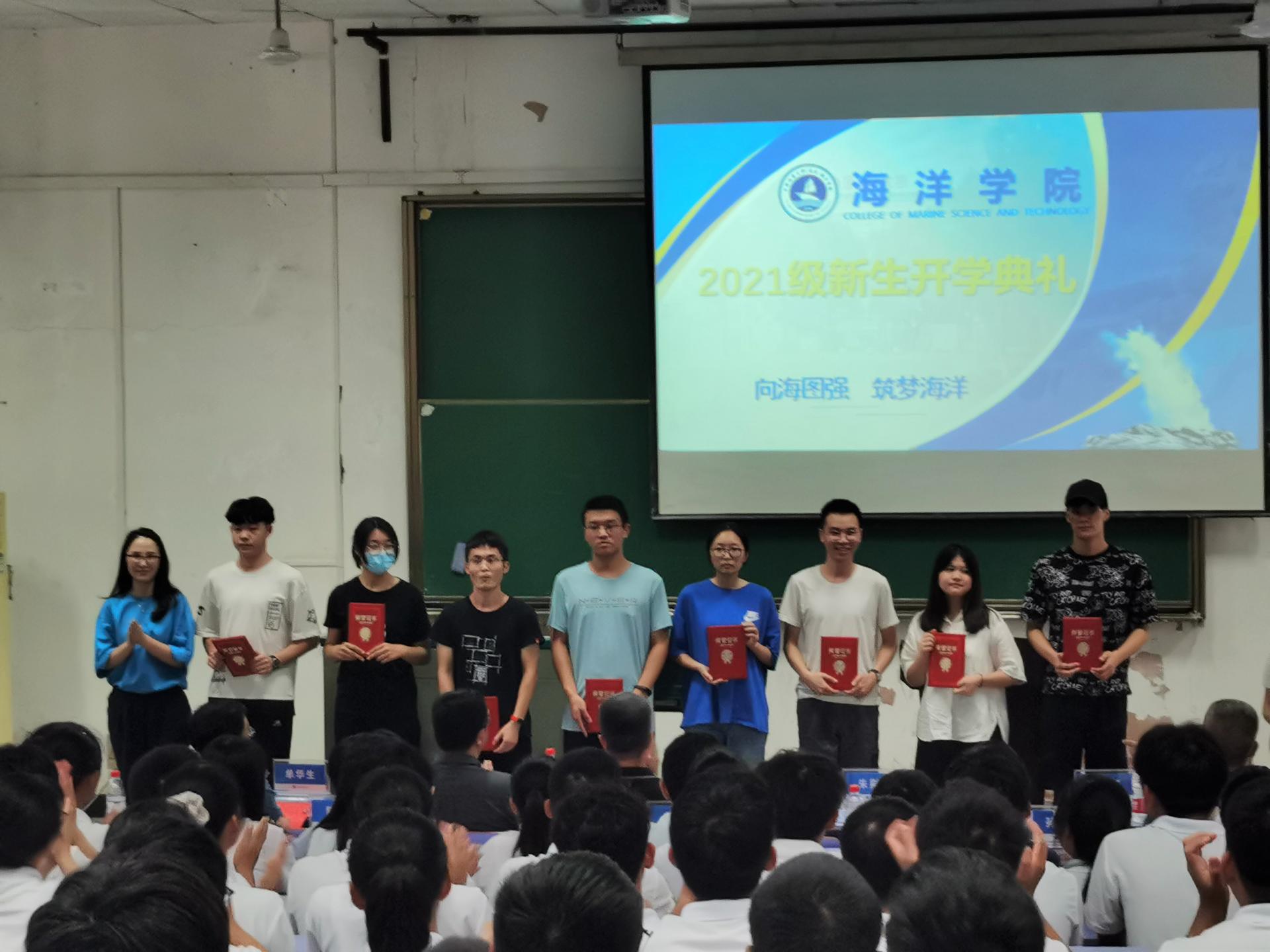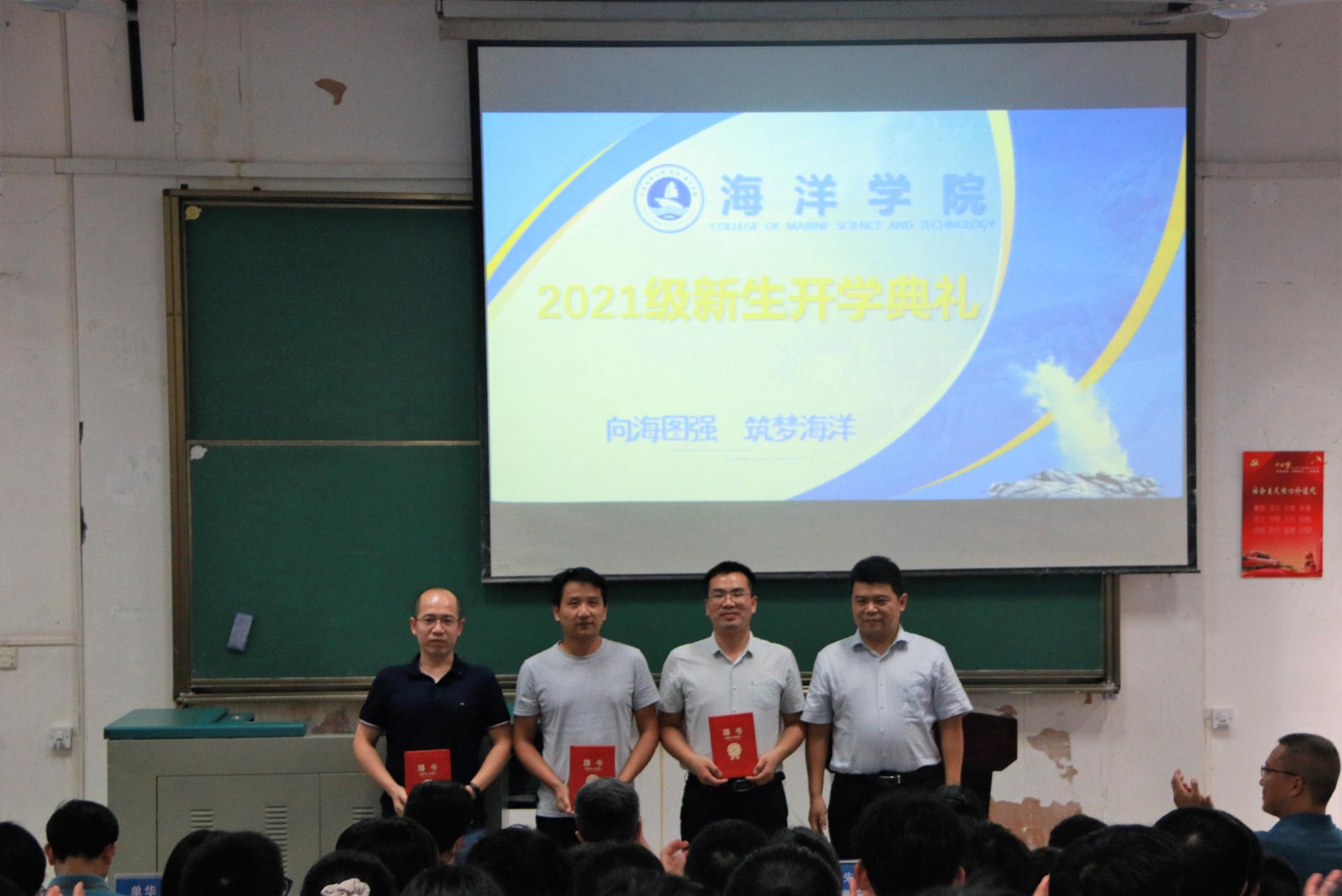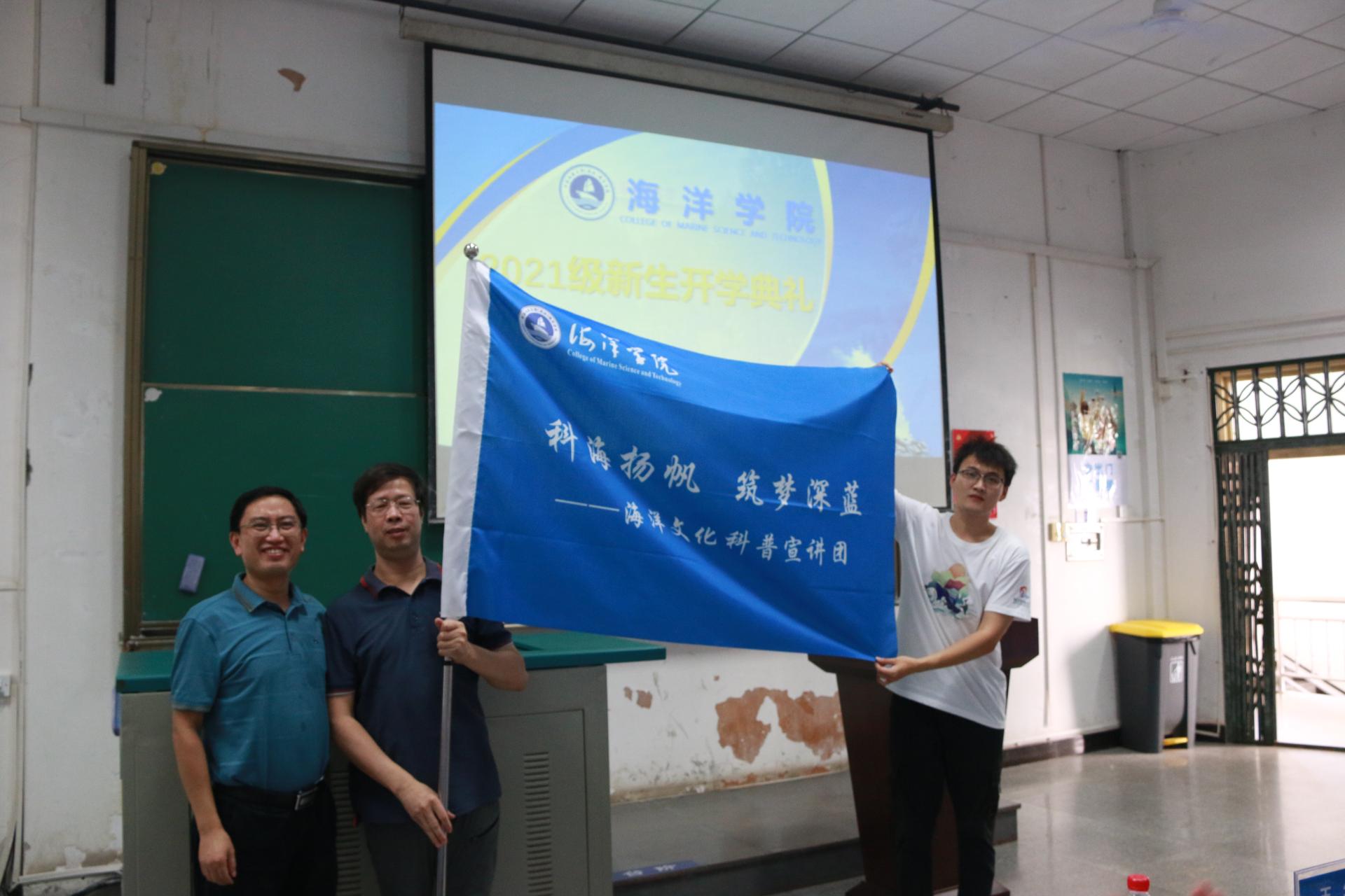 开学典礼表彰仪式上,由校团委书记朱荆萨为海洋文化节优秀营员颁发证书,科发院副院长单华生为“科海扬帆,筑梦深蓝”海洋科普宣讲团授旗,黑人AV 副院长姜涛为2021级班主任颁发聘书。