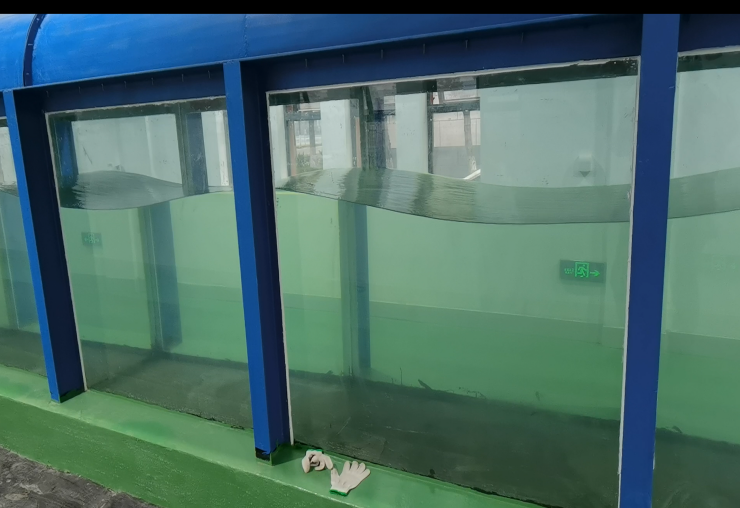 图 2风浪流水槽(系统) 图 3 风浪流水槽(造波机)造波过程