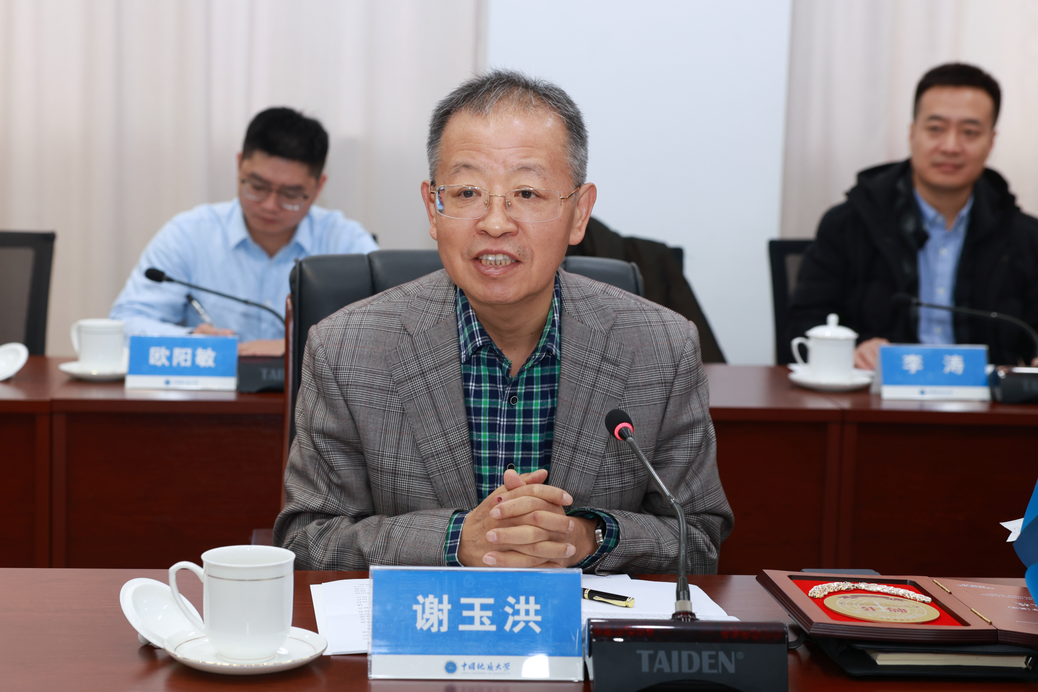谢玉洪回忆了在校学习时光,并感谢母校和恩师的辛勤培养。他表示将积极参与母校的学科建设和人才培养,不断促进中国海洋石油集团与母校的交流和合作。他希望学校发挥学科特色优势,不断深化产教融合,共同推动深水油气、压溶气、地热、压差发电等多能源盆地融合发展的科学研究和人才培养,为国家科技事业发展做出更大贡献。