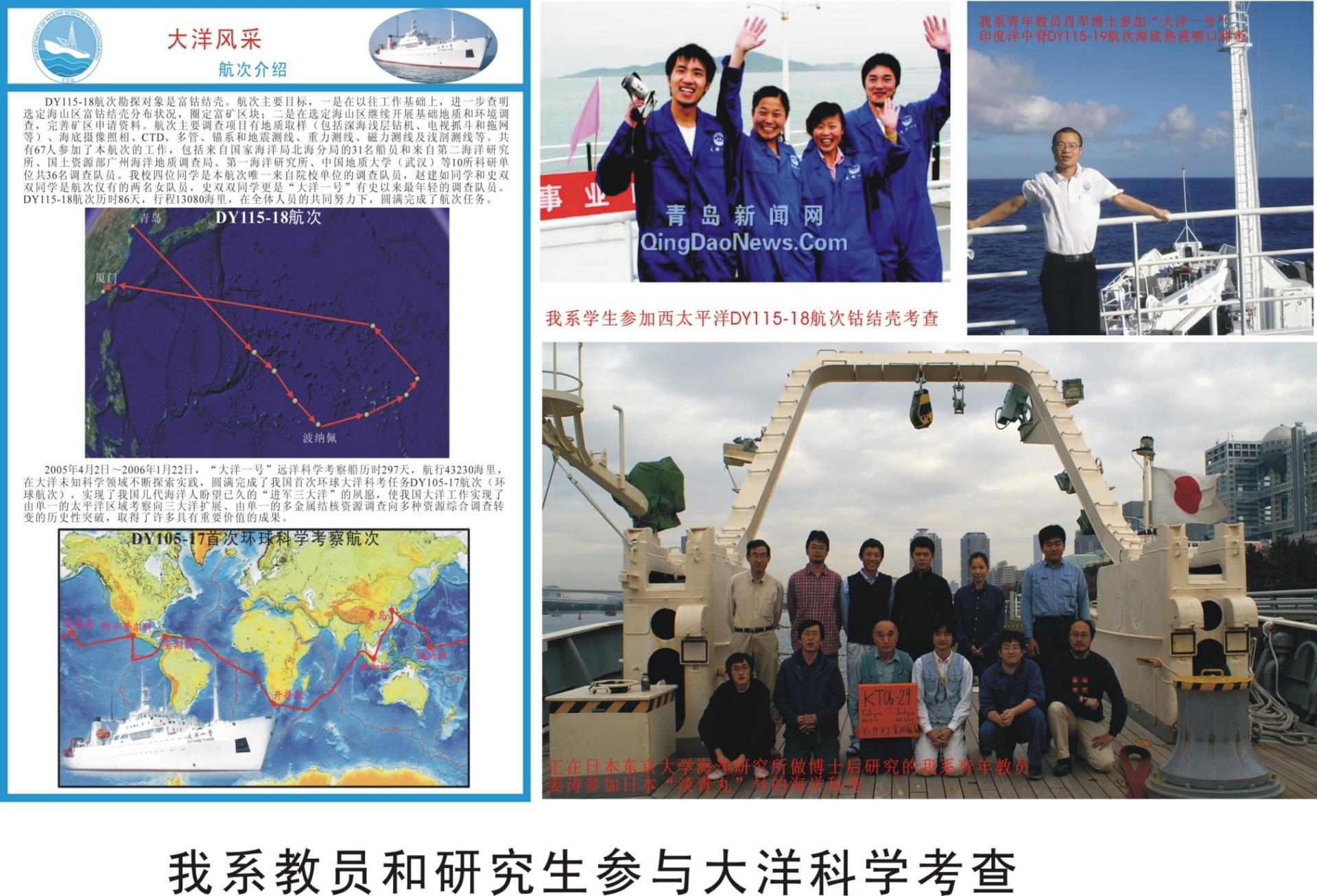 组织20余人次参加J.Resolution、Chikuy、Marion Dufresgne、“太阳号”、“大洋一号”、“海洋四号”、“琼沙三号”等国内外科学考察船在赤道西太平洋、东北太平洋、西南印度洋、北大西洋、北冰洋以及中国海域、鄂霍次克海、日本海、日本南海、挪威海等地的地质调查和环球考察。