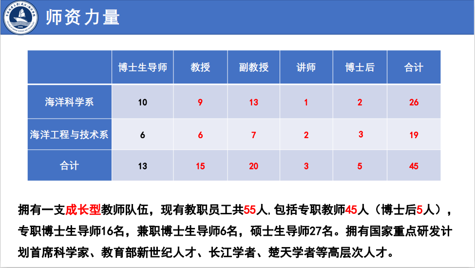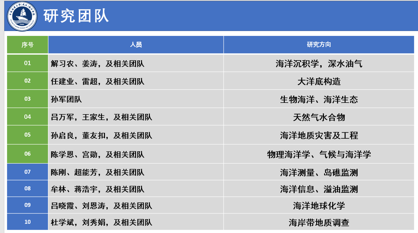 黑人AV 始源于20世纪50年代学校组建的海洋地球物理勘探教研室,成立于2016年,现有海洋科学湖北省重点学科1个,海洋科学博士后科研流动站1个,海洋科学一级学科博士学位授予权1个,海洋科学一级学科硕士学位授予权1个,地质工程专业学位授予权1个,拥有“本科-硕士-博士”完整人才培养体系。学院现有教职工55人,其中教授15人、副教授22人、讲师3人,拥有国家重点研发计划首席科学家等高层次人才。