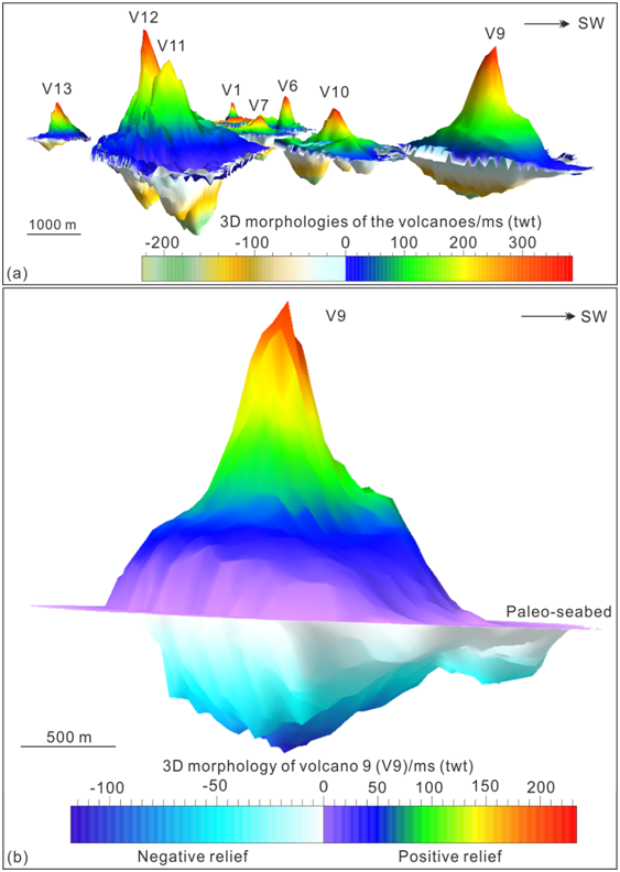图1:深水火山三维结构特征(上部锥形火山体以及下部火山喷口形凹陷)