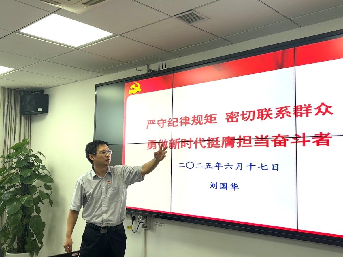 学院党委书记刘国华以《严守纪律规矩 密切联系群众 勇做新时代挺膺担当奋斗者》为题为上党课。他首先播放了《风筝》大结局郑耀先最后的愿望是看一次升国旗的短视频,和与会者讲述了一些老一辈共产党人是如何始终坚守自己的理想信念;他随后解读了中国共产党的纪律体系、规矩体系,要求大家永远牢记入党誓词、党的根本宗旨、党的六大纪律和“四个服从”纪律要求,不论是升学还是就业,此生都必须始终严格把控好自己的思想总开关,真正做一名爱党、爱国、爱学、爱习、爱校、爱岗、爱家、爱己且勇立青春潮头的新时代向上好青年;紧接着他从学习和实践马克思主义关于坚守人民立场的思想、党的宗旨的确立及发展、党的宗旨的深刻含义及时代要求、始终坚持党的群众路线、勇做新时代挺膺担当奋斗者五方面,详细讲明了必须牢固树立人民群众是历史创造者的基本观、坚持全心全意为人民服务的根本宗旨、始终保持同人民群众的血肉联系,他带领大家学习“反四风”“八项规定”主要精神,剖析了各类相关案例,教育引导全体党员向张思德、雷锋、焦裕禄、张桂梅、黄文秀等最具时代影响力的优秀共产党员学习,坚定不移听党话、跟党走,勇于、敢于、善于用脚步丈量祖国大地,在推进强国建设、民族复兴伟业中成为一名信念坚定、品格高尚、脚踏实地、久久为功的时代新人!