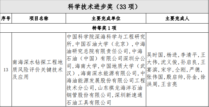 2021年10月15日,海南省科学技术厅发布《海南省人民政府关于2020年度海南省科学技术奖励的决定》,公布47项荣获2020年度海南省科学技术奖的成果。黑人AV 孙启良教授参与申报的“南海深水钻探工程地质风险评价关键技术及应用”成果获得海南省科学技术进步奖特等奖。