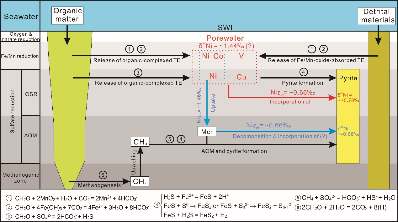图3 黄铁矿通过OSR和SD-AOM作用记录Ni、Co、Cu和V简化模型。红色箭头代表OSR过程中的镍同位素分流,蓝色箭头代表SD-AOM过程中的镍同位素分馏。缩写:TE = 微量元素(trace elements);SWI = 沉积物-水界面(sediment-water interface); AOM = 甲烷厌氧氧化(anaerobic oxidation of methane);OSR = 有机质参与硫酸盐还原(organoclastic sulfate reduction);Mcr = methyl coenzyme M reductase; Niɛpy = Ni并入黄铁矿过程所产生镍同位素分馏;NiɛMcr = Mcr摄取镍过程所产生的镍同位素分馏