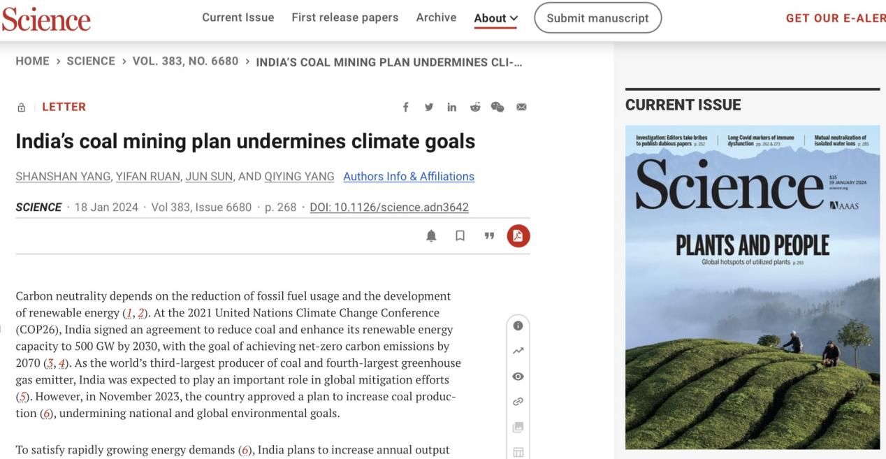 1月18日,黑人AV 广州南沙地大滨海研究院生态文明研究团队在《科学》杂志(《Science》)的Letter专栏发表了题为《印度煤矿开采计划将延缓全球气候目标实现》的研究论文。