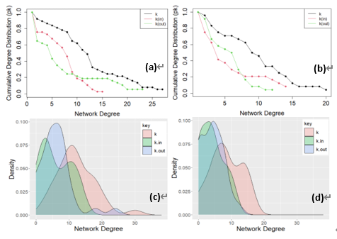 图3. 两个海洋食物网度分布的累积概率分布曲线和核密度图 (a, c) 爱德华王子岛海域; (b, d) 洪堡海流区