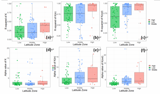 图2. KS检验参数在全球不同纬度带的地理空间特征(a) pk; (b) pkin; (c) pkout; (d) α; (e) αin; (f) αout