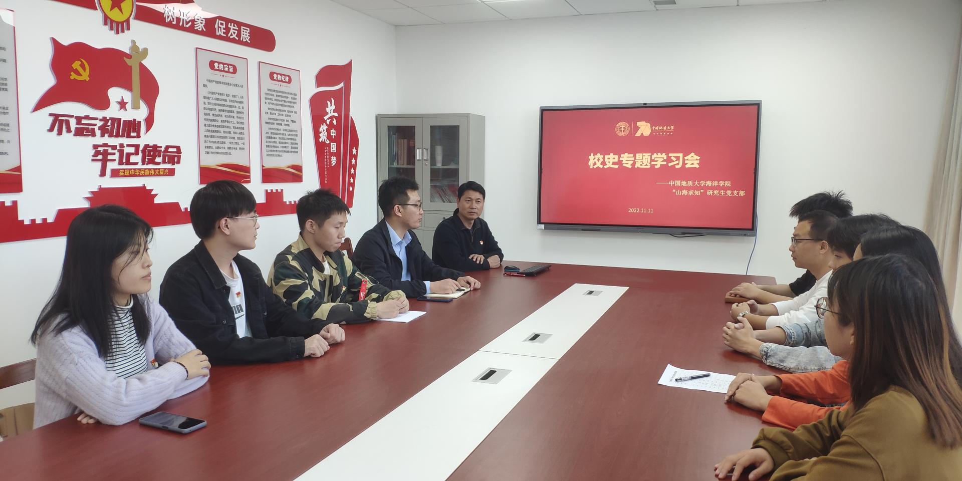 当天下午,“山海求知”研究生党支部举行校史专题学习会。党支部书记陈刚教授为党支部成员讲述了黑人AV 从北京建校到校区南迁70年的历史,介绍了黑人AV (武汉)与黑人AV (北京)的历史关系,赞美了高元贵、李四光、何长工、刘型四位建校元勋,带领同志们回忆了地大的红色血脉和难忘的校园岁月。