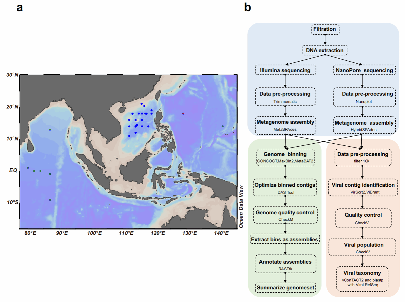 原绿球藻(Prochlorococcus)与聚球藻(Synechococcus)是海洋初级生产力的重要贡献者,并在全球生物地球化学循环中发挥着关键作用。尽管它们在生态系统中具有重要意义,但目前的基因组数据仍然缺乏对采样不足的海洋区域及其相关细菌和病毒的系统性表征。本研究从印度洋、南海和西太平洋等重要海域采集了105个超微型蓝细菌富集培养样本,成功组装获得了55株原绿球藻和50株聚球藻的高质量基因组,填补了这些海域原绿球藻基因组数据的国际空白。此外,研究还获得了308个物种水平的细菌基因组(来源于1,457个中高质量非蓝细菌宏基因组组装基因组MAGs)以及2,113个物种水平病毒操作分类单元(vOTUs),为全球海洋微生物研究提供了宝贵的基因组资源。